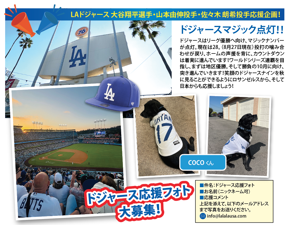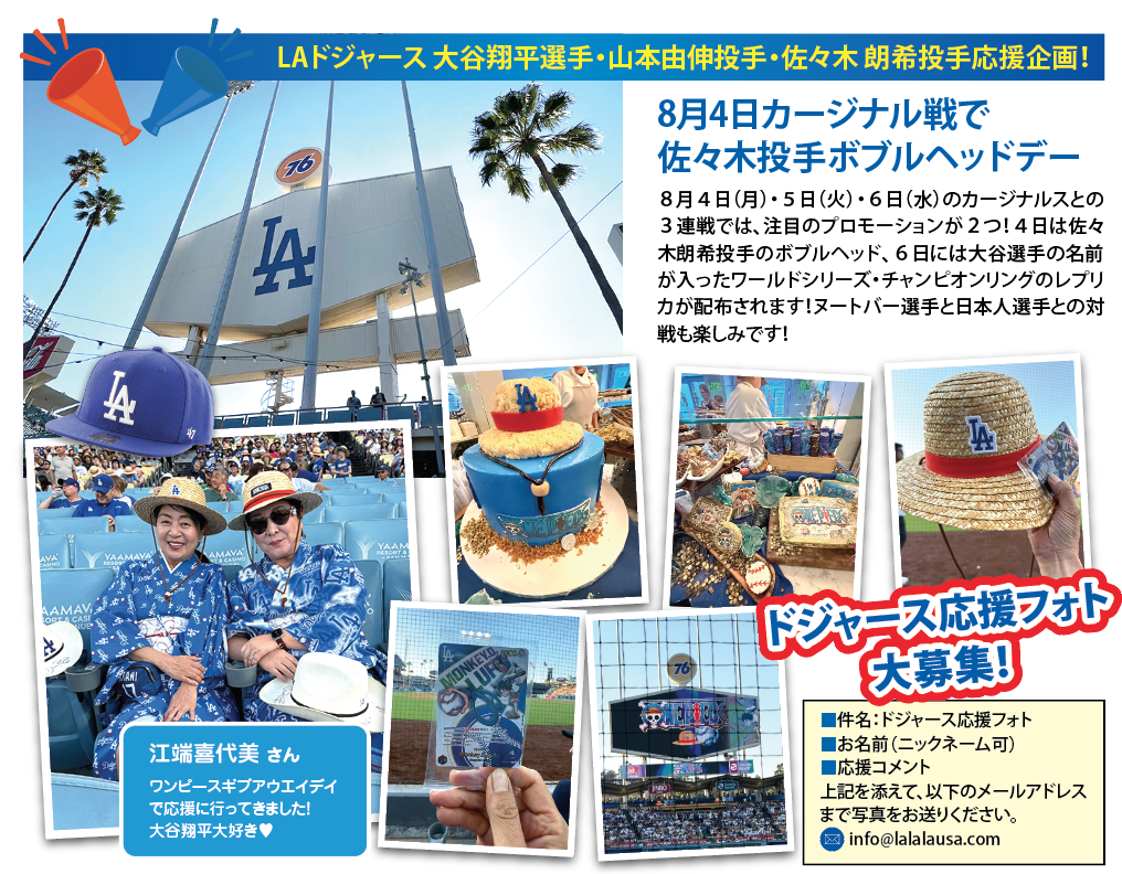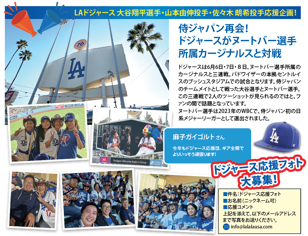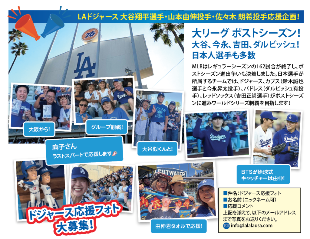 今季のメジャーリーグは見どころが満載!! 先週行われたドジャース vs カブス戦では、ドジャース大谷翔平選手、山本由伸投手、カブス鈴木誠也外野手、今永昇太投手の日本対決が繰り広げられドジャースファンのみならず大興奮のゲーム観戦となりました。今後も日本人選手の活躍が期待され、ますます盛り上がるメジャーリーグ!さあ、みんなで応援しましょう!