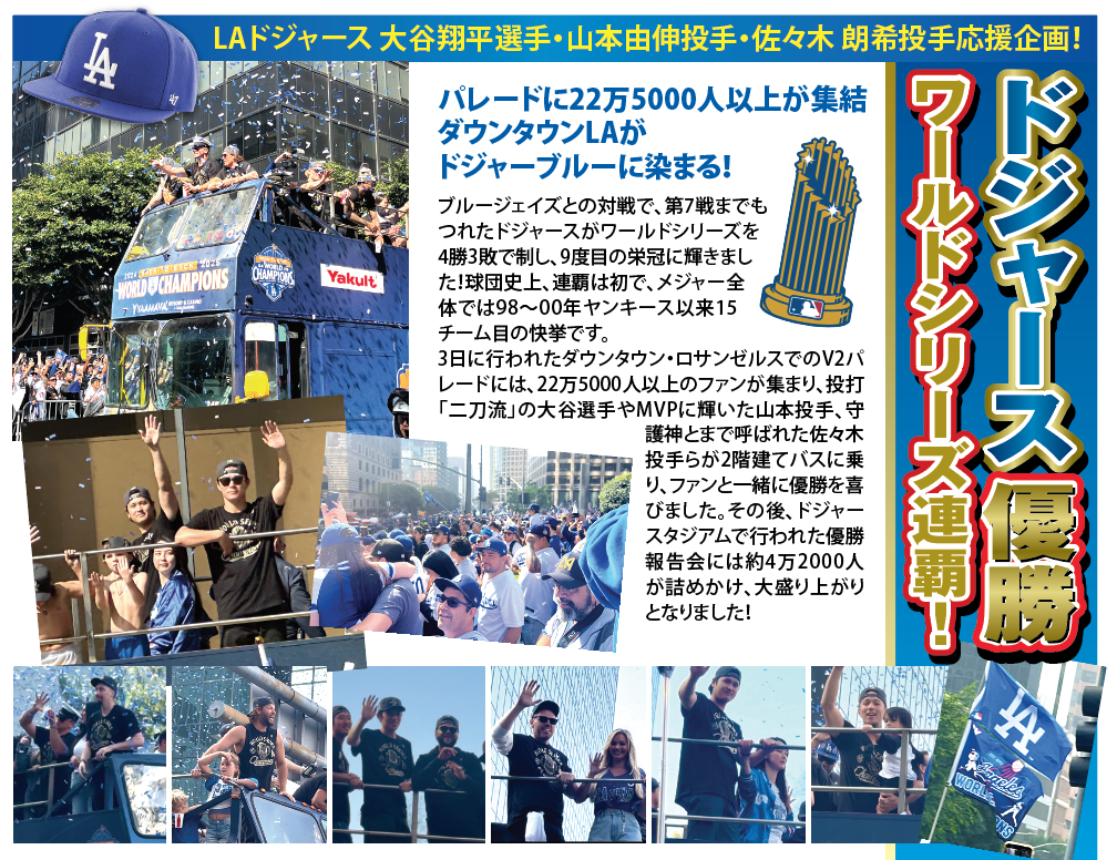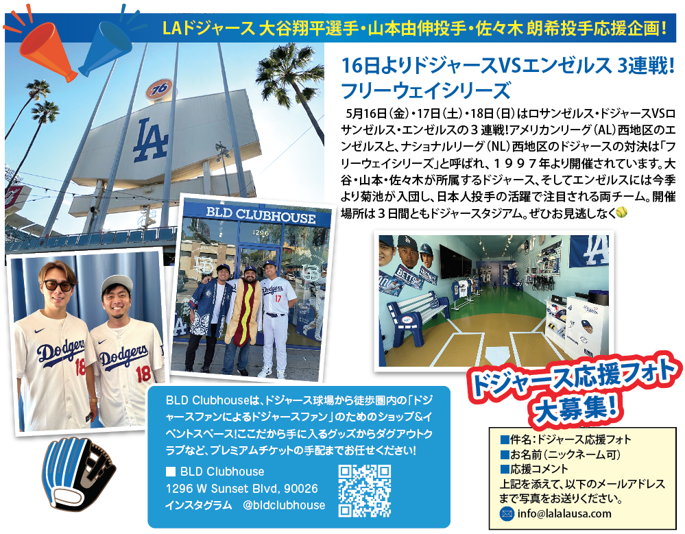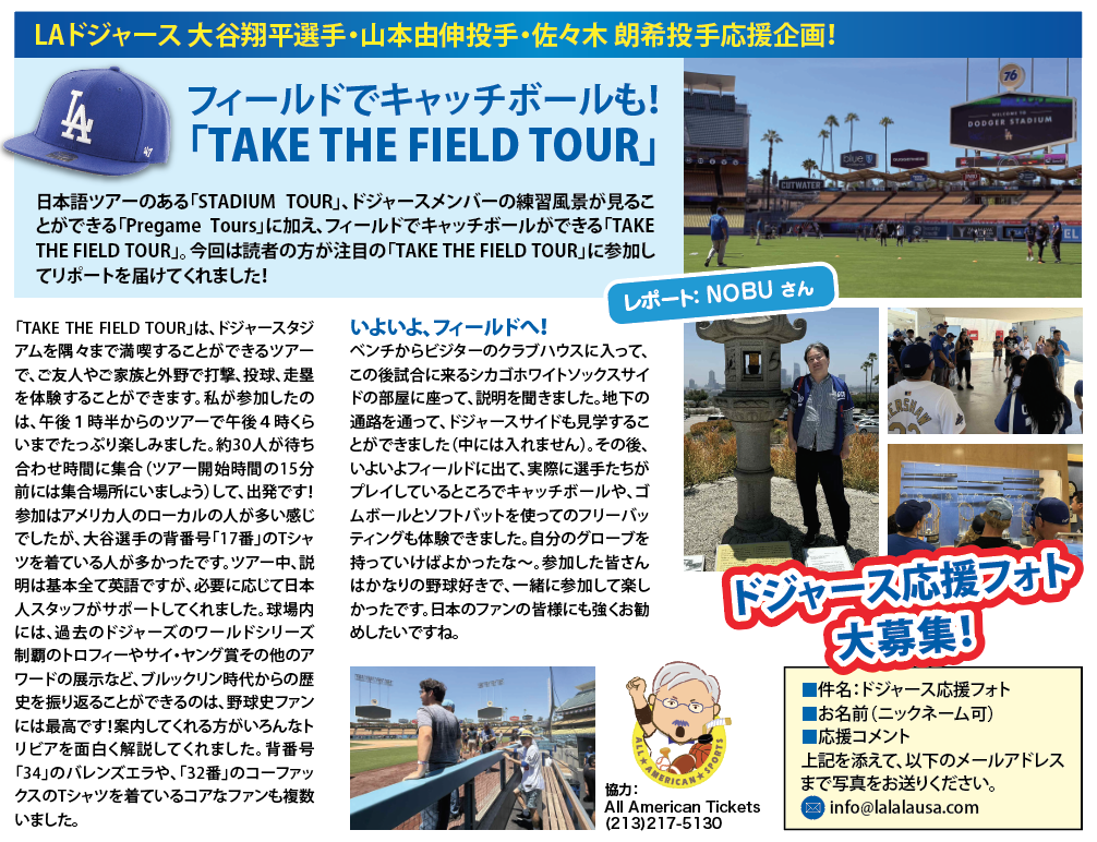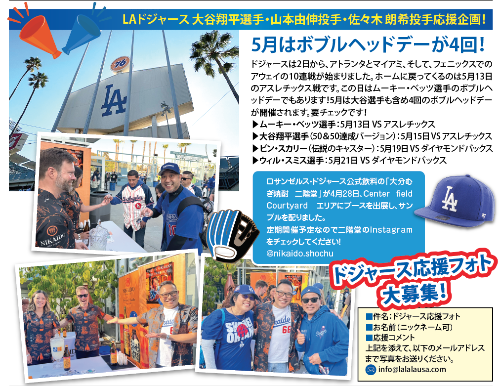 今季のメジャーリーグは見どころが満載!! 先週行われたドジャース vs カブス戦では、ドジャース大谷翔平選手、山本由伸投手、カブス鈴木誠也外野手、今永昇太投手の日本対決が繰り広げられドジャースファンのみならず大興奮のゲーム観戦となりました。今後も日本人選手の活躍が期待され、ますます盛り上がるメジャーリーグ!さあ、みんなで応援しましょう!
