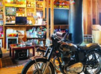 ガレージはコンクリートの土間仕上げで、5台のハーレーダビッドソンを筆頭に合計7台のオートバイ、さらに1928年式のフォード・モデルA・ピックアップ・ロードスターを格納。階段下には工具や整備スペースも設け、オートバイの重整備やレストレーションなどの作業も楽しんでいる。 一方、ガレージの2階は足場板を敷設してリビングスペースへと変更済み。ソファやテレビ、ベッドやカウンターも備えて、バイク仲間が集うスペースとした。天井がなく小屋組が露出した現し仕上げとしているため、見上げると時代を経てきた無垢の木材が縦横に走っているのがよくわかるのもユニークだ。