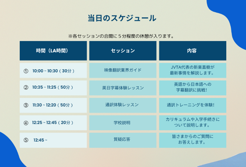 業界セミナーではJVTA代表の新楽直樹氏が映像翻訳の需要やAI技術の発展における変化について解説。体験レッスンでは英日映像翻訳と通訳にチャレンジすることができる。またロサンゼルス校マネージャーから入学手続きなどをご案内。当日はご希望やご都合に合わせて参加するセッションを選択することも可能。