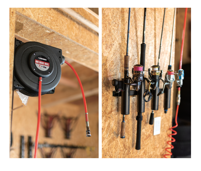 さらに注目したいのは居室側の2階からアクセスのできるロフト部だ。ガレージの上に張り出したバルコニーのようなスペースにはデスクや棚を設置、趣味の釣り道具、キャンプ道具を収納するスペースや、コットを置いたリラックススペースも追加されており、愛車を愛でながらコーヒーを嗜むこともできるようになっている。