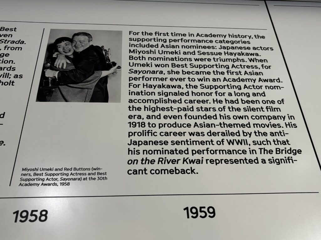 ハリウッド映画『サヨナラ』(1957)で、アジア人俳優として初めてのアカデミー賞助演女優賞を受賞したMiyoshi Umekiさんについてのパネルも発見。これまで彼女についてあまり多くの文献を読んだり、詳しく学んでこなかったのですが、今回をきっかけに彼女についてもっと知りたいと思いました。