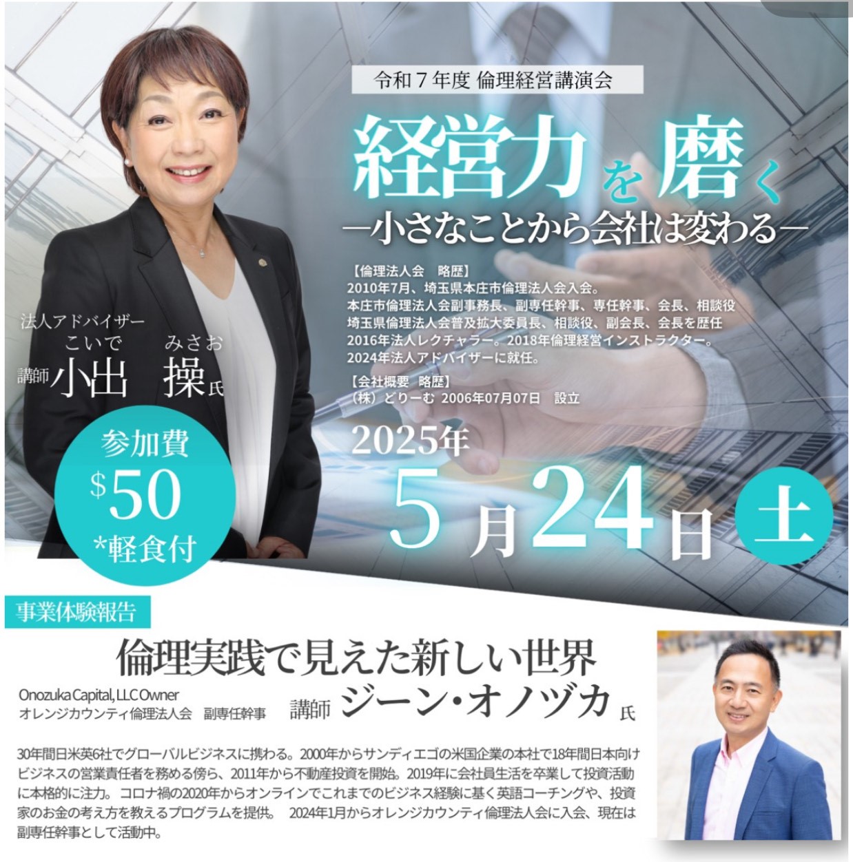 株式会社どりーむ取締役会長・小出操氏による講演『経営力を磨く 小さなことから会社は変わる』と、Onozuka Capital代表、オレンジカウンティ倫理法人会 副専任幹事のジーン・オノヅカ氏による事業体験報告『倫理実践で見えた新しい世界』が5/24(土)に開催される。
