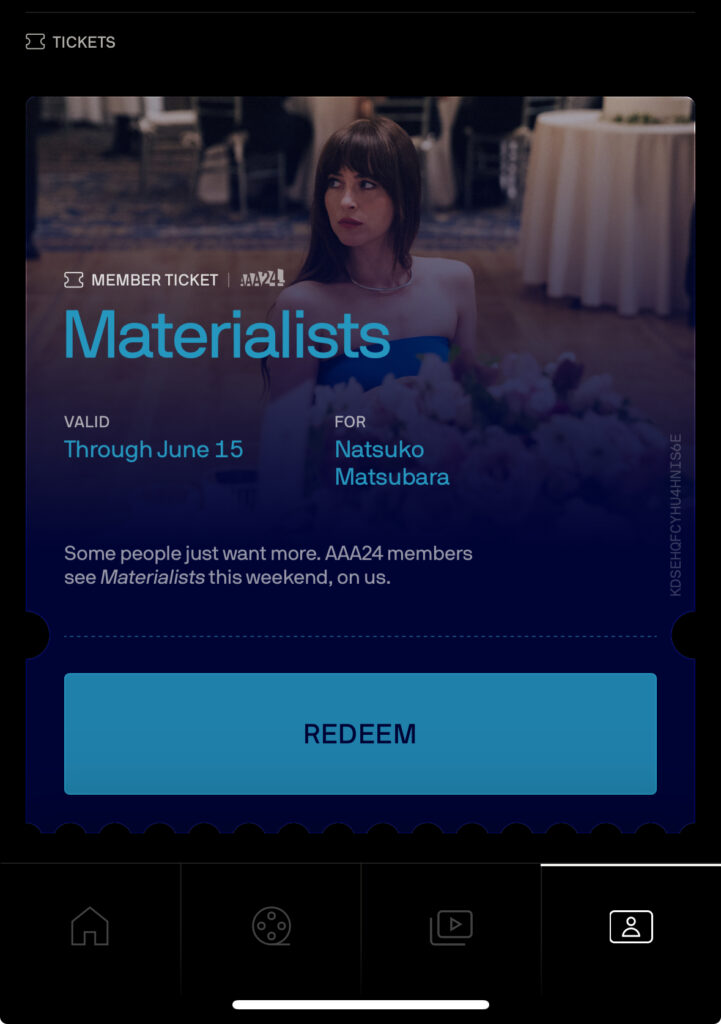 無料映画チケットについてですが、A24アプリで、利用可能なチケットの引き換えをクリックすると、近くの映画館が表示され、上映日時を選び、座席を選択できます。当日は、アプリ上に表示される電子チケットを映画館で見せるだけで、とても簡単です。