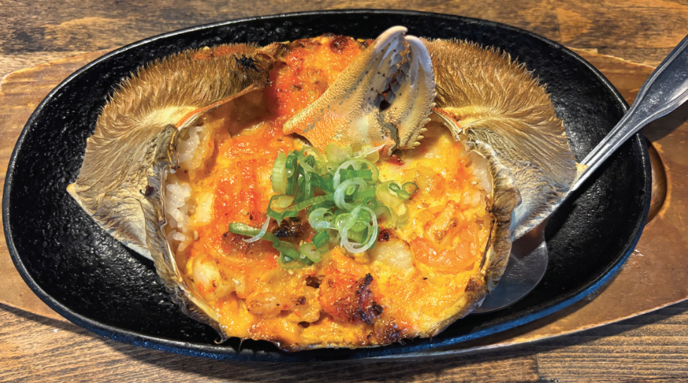 アツアツの鉄板に乗って登場したのは、カニの甲羅を器にしたインパクト大の人気メニュー「ダイナマイト」。小ネギが彩りよくトッピングされ、ぐつぐつと煮立つクリームソースが食欲をそそります。火傷に気をつけながらスプーンですくってみると、中にはカニ、エビ、貝柱、きのこ、玉ねぎなど、海の幸と野菜がぎっしり。さらに、甲羅の両サイドには酢飯が詰められており、さっぱりとした味わいがシーフードの旨みと絶妙にマッチ!生クリーム仕立てのクリームソースには、まさごやチリソースなどが加えられており、まろやかさの中にプチプチ食感とピリ辛が加わり、クセになる美味しさです。