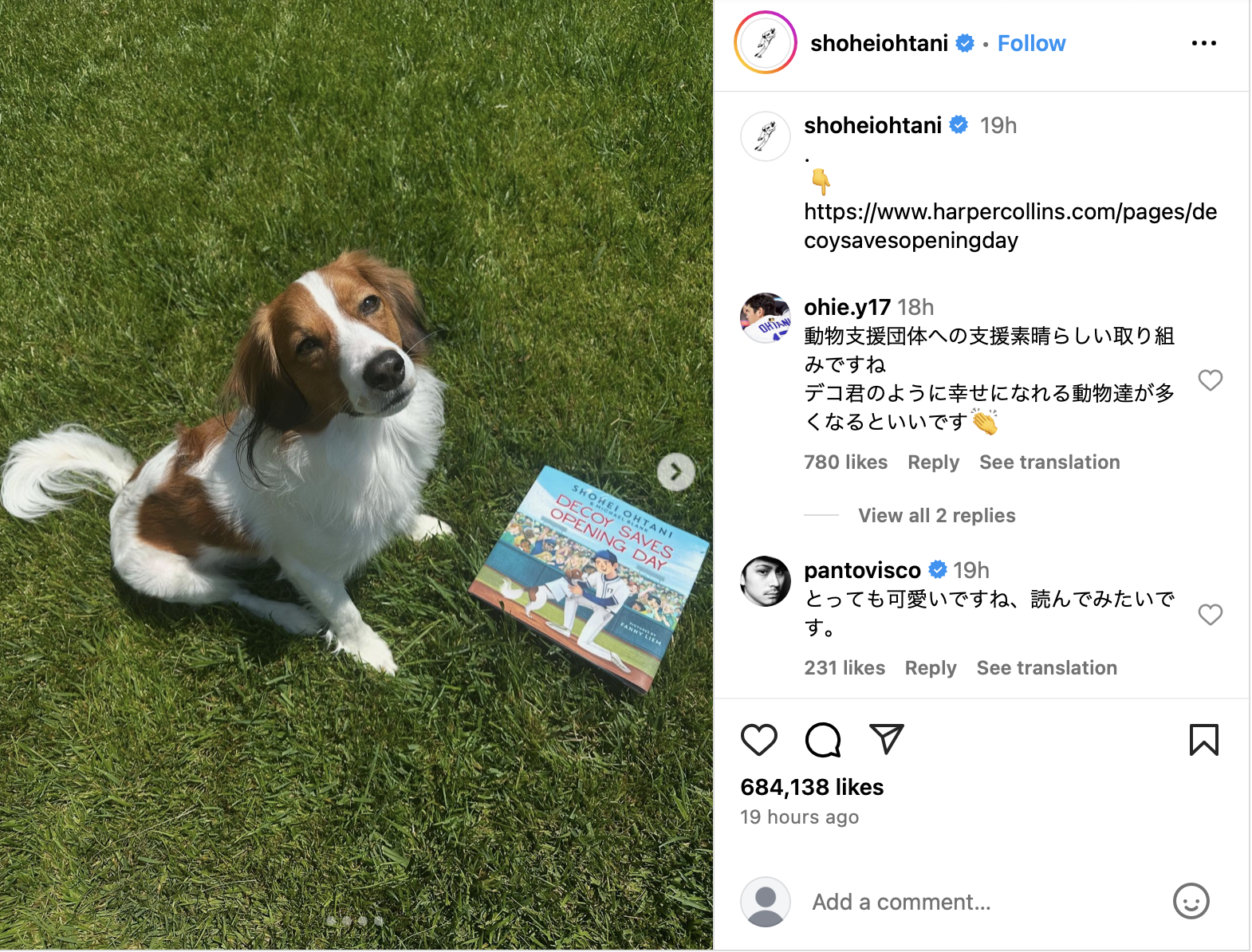 【ロサンゼルス17日】ドジャースの大谷選手と愛犬デコピンを題材にした絵本が出版される。17日、大谷選手は自身のインスタグラムで『DECOY SAVES OPENING DAY(デコピンが開幕戦を救う)』の表紙を公開した。