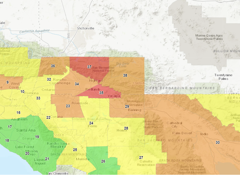 月曜日の予報では、ハイランド北部のサンバナディーノ国立森林公園(レイク・アローヘッド周辺を含む)、レッドランズ、ロマリンダ、ユカイパでは、健康に影響を及ぼす大気質になると予想されている。