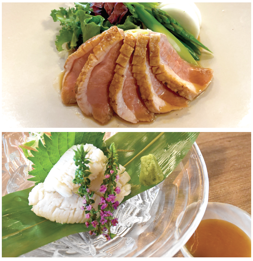 「ローストダック」は、柔らかな鴨肉に甘みのあるオレンジソースがぴったり。クリーミーなマッシュポテトに、アスパラやカブも添えられ、彩り豊かな一皿です。夏限定の「鱧おとし」は、氷を敷いた器に白く花咲く身が美しく盛られ、目にも涼やか。絶妙な火入れで仕上げられた鱧は、表面は霜降り、中はレアで、皮の弾力がクセになるおいしさです。添えられたみょうがや青じそ、わさびの清涼感が味を引き締めます。梅肉ソースを合わせれば、より爽やかで上品な味わいになります。