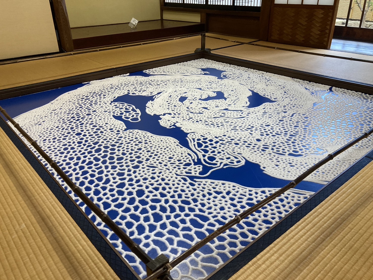 塩を使って床に巨大な模様を描く山本基さんは、作品「時を紡ぐ」を展示。清めの塩から着想を得て塩を作品に使い続けている。