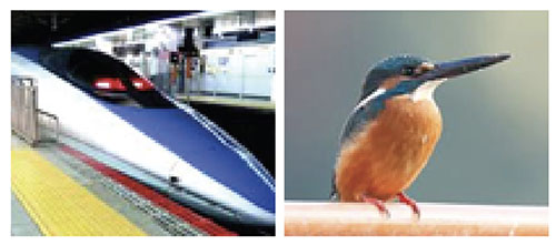 その他、カワセミのくちばしは新幹線の構造に多大な影響を与えている。水面の小魚をスムーズに捕獲するために細く尖っているが、新幹線の先端にこの構造を応用する事で空気抵抗は減少し騒音も緩和された。