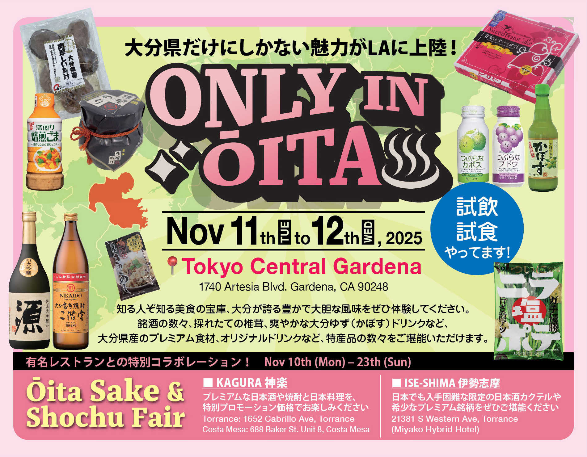 11/10(月)~11/23(日)まで、Kagura2店舗(トーランス店、コスタメサ店)とIse-Shimaで、大分 酒&焼酎フェアを開催!