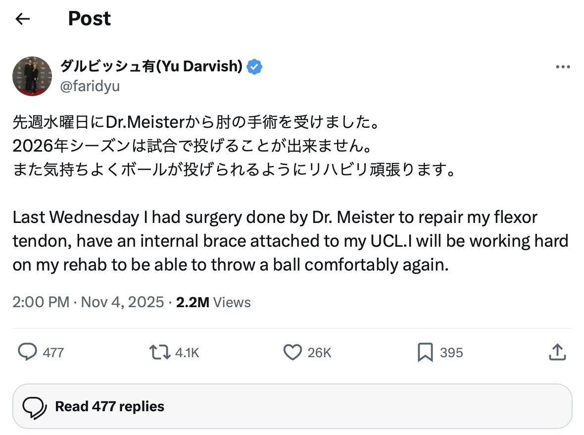 ダルビッシュ投手ははXに「2026年シーズンは試合で投げることができません。また気持ちよくボールが投げられるようにリハビリを頑張ります」と投稿した。