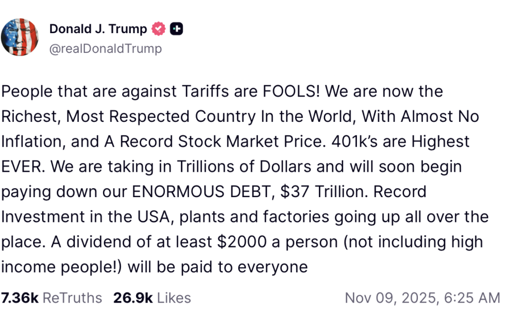 「「全ての国民に1人当たり2000ドル配布」 トランプ大統領がSNS投稿(11/10)」への1件の返信