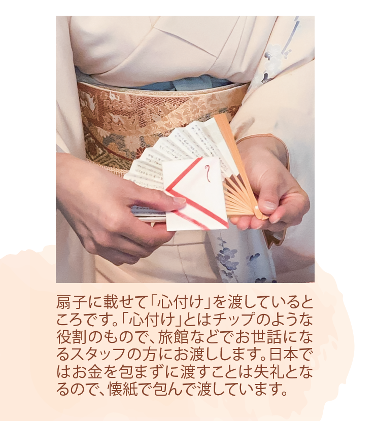 他にも、「物の受け渡しの扇子」という使い方があります。日本では、目上の人に直接物を渡すことは畏れ多くてできないと考えます。その為、渡す物をお盆に載せ、お相手にお盆から取っていただく、もしくは中継ぎの人にお盆ごと渡して目上の人に取り次いでいただきます。お盆がない時は、何かをお盆代わりにするのですが、その一つが扇子です。扇子を開き、その上に渡す物を載せて差し出します。今は、そのような所作で物の受け渡すことはほとんどなくなりましたが、名残りはあります。名刺を交換する時、日本のマナーでは名刺入れを名刺に敷いて行います。それは、「貴方に直接物を渡すのは畏れ多いので、お盆に載せて渡します」という気持ちを表現しているのです。