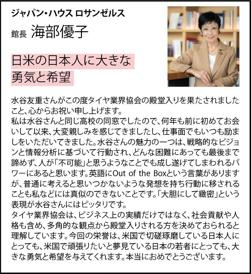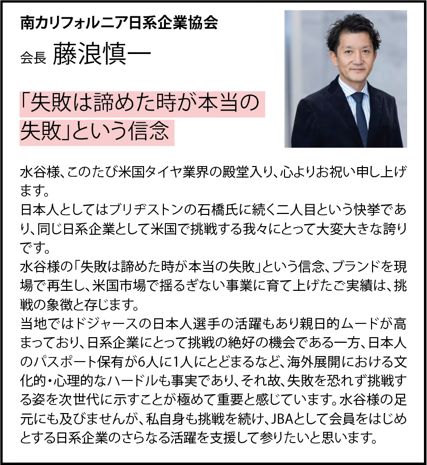 2025年11月3日、ニットータイヤUSAの常勤顧問であり名誉会長である水谷友重氏(以下:水谷氏)が、米国タイヤ業界における最高の栄誉のひとつであるタイヤ業界の殿堂入りを果たした。(タイヤ業界協会【Tire Industry Association(TIA)】主催)。TIAは、1921年に設立された100年以上続いている権威ある協会で、タイヤ殿堂は1985年から始まり、40周年を迎えたところだ。