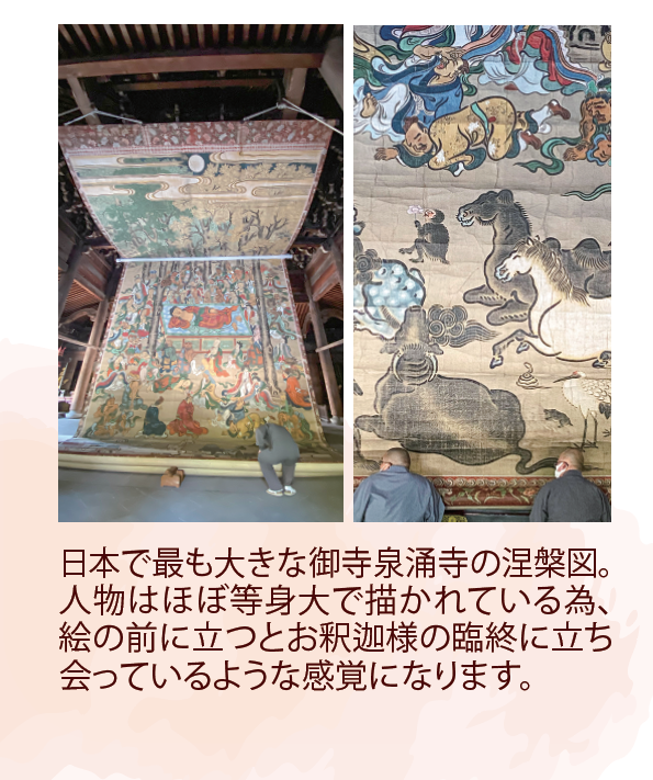 日本最大級の涅槃図は御寺泉涌寺(京都)のものです。今から約200年前に描かれ、縦約16m、横約8m、重さは約150kgもあります。