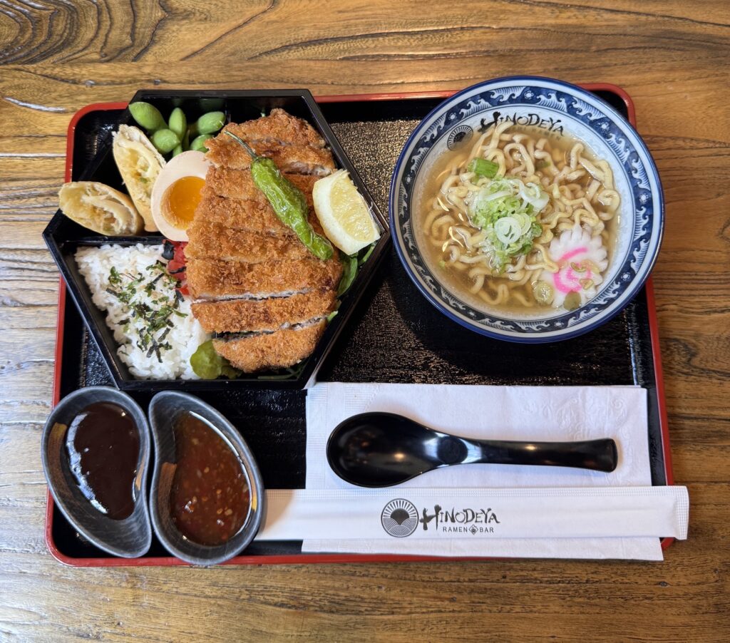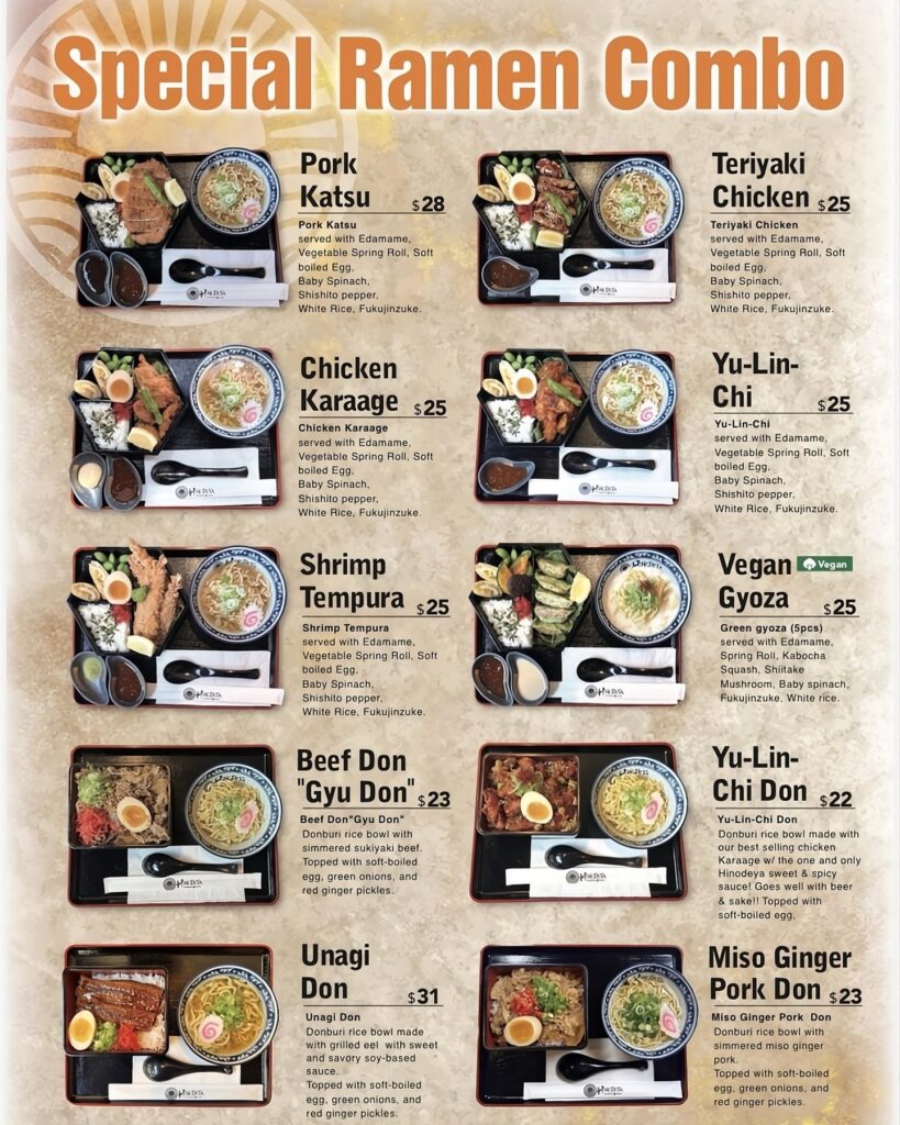 人気のポークかつ、Hinodeyaオリジナル唐揚げ、オリジナルソースで仕上げた油淋鶏をはじめとした全10種類のメインから選べる一品に、自慢のラーメンがセットになって$22〜。